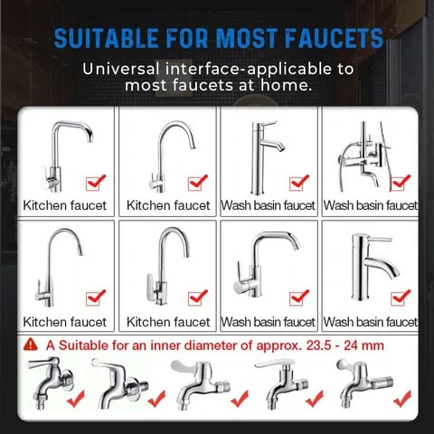 This faucet water filter can be directly installed on a faucet with an external thread diameter of 22mm, or it can be installed on a faucet with an internal thread diameter of 23.5-24mm together with the attached faucet adapter. It can be used for kitchen, toilet, sink and bathroom faucets, etc.